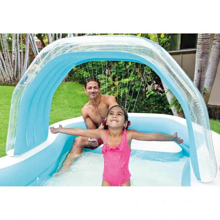 Семейный надувной бассейн Intex арт.57198 с сиденьями - это объемный бассейн, по центру которого находится надувная арка. При подключении садового шланга из арки льется небольшой водопад, охлаждая малышей в жаркую погоду. По краям конструкции надувные подушки-сиденья. Вместимость воды - более 700 литров. Бассейн удобен в использовании и безопасен для детей от 3 лет. Клапан для слива воды находится в дне бассейна. Насос в комплект не входит.