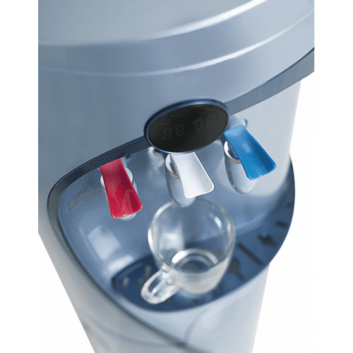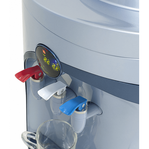 Кулер для бутылированной воды V760CS Blue имеет электронное табло с указанием температуры горячей и холодной воды, защиту от детей на горячую воду, кран воды комнатной температуры.