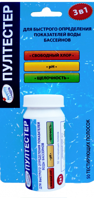 Пултестер от отечественного производителя Маркопул Кемиклс предназначен для быстрого определения рН, свободного хлора и щелочности в воде бассейнов. В комплекте 50 тестирующих полосок.